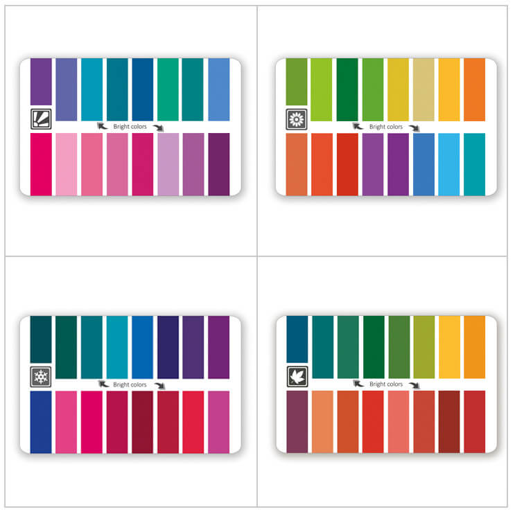 All colors are in all color seasons; it’s the type of shade of that color that varies. All seasons have red, but red has different shades in all four seasons. Red in spring is bright, light, and warm; red in summer is grayish and soft; red in autumn is dark and warm; red in winter is cooler, strong and primary. The same goes for blue, green, etc. This creates a very harmonious color palette within a single season that appears intuitively coherent.